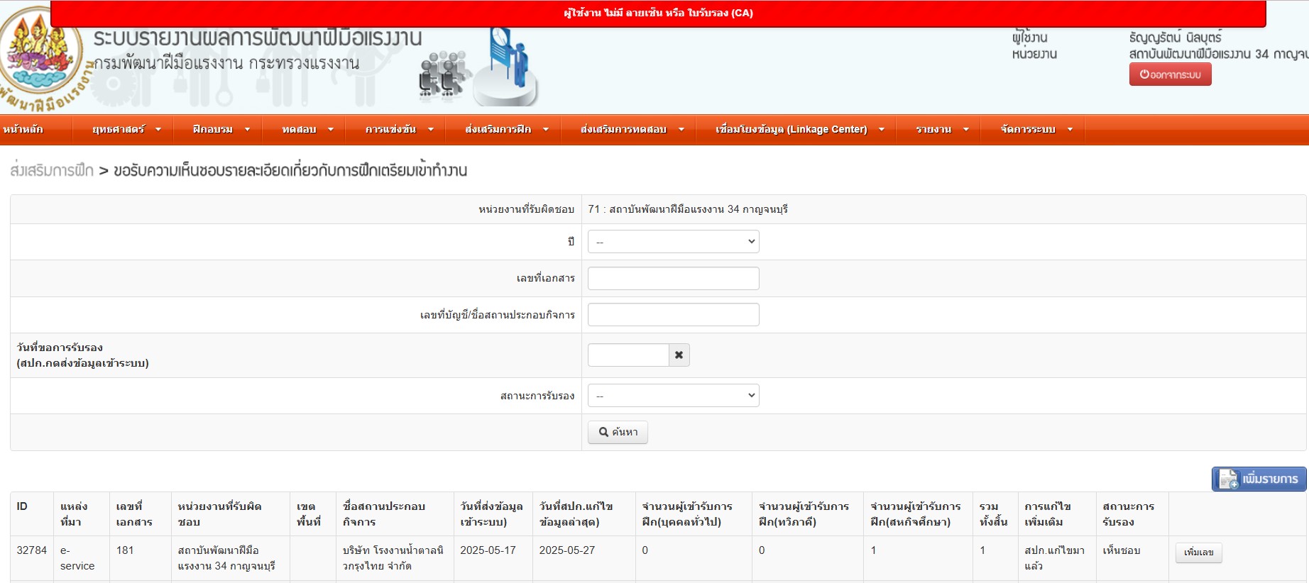 เมนู ขอรับความเห็นชอบรายละเอียดเกี่ยวกับการฝึกเตรียมเข้าทำงาน(กรณีรับ นศ.ฝีกงาน) หลังจากนายทะเบียนกดอนุมัติแล้ว เจ้าหน้าที่ไม่สามารถใส่เลขอนุมัติได้ ตั้งแต่วันที่ 27 พ.ค. 2568 เกิด error จนถึงปัจจุบันยังใส่เลขอนุมัติไม่ได้ค่ะ
