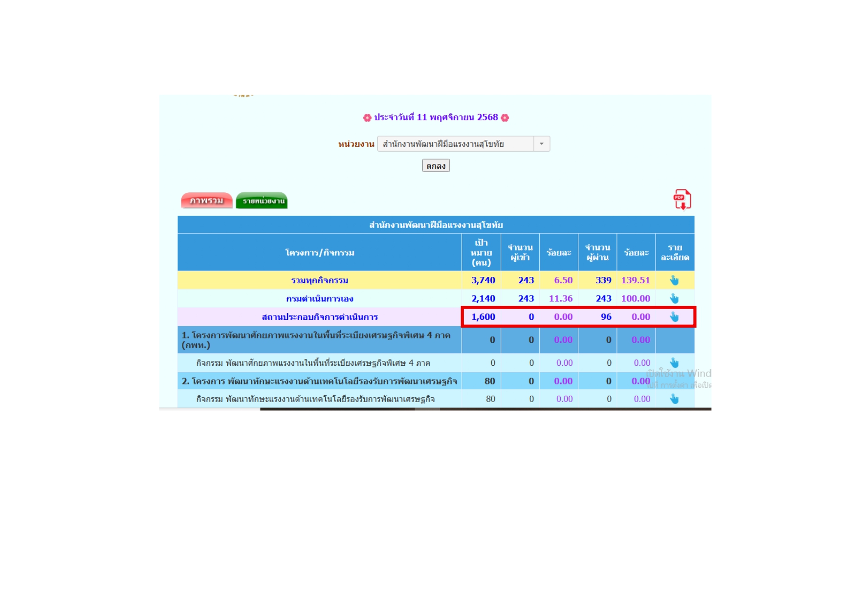 ![]() | แจ้งระบบรายงานแผน/ผล (War room) ของสำนักงานพัฒนาฝีมือแรงงานสุโขทัย กรณีสถานประกอบกิจการดำเนินการฝึกอบรมเอง จำนวนผู้เข้ารับการอบรมไม่ขึ้นจำนวนคน ขึ้นเฉพาะจำนวนผู้ผ่านการฝึกอบรมครับ ![]() | ![]() | ||||||