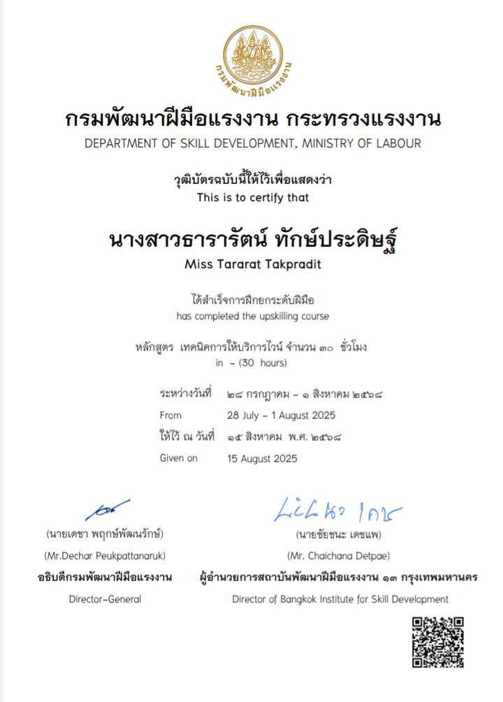 ในวุฒิบัตรไม่มีชื่อภาษาอังกฤษ ของหลักสูตร// หลักสูตรเทคนิคการให้บริการไวน์ รหัสหลักสูตร 812001732317 โดยสพร. 13 กทม. เอาเข้าโครงการพัฒนาทักษะแรงงานรองรับนโยบาย Soft Power  อบรมระหว่างวันที่ 28 ก.ค. - 1 ส.ค. 68 2568