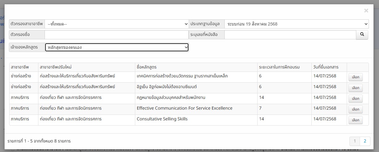 | 4951 | ระบบส่งเสริมการพัฒนาฝีมือแรงงาน | วิภาดา | กรุงเทพมหานคร | ทางบริษัทแจ้งว่าในระบบยื่นรับรองหลักสูตรมีหลักสูตรที่ไม่ใช่ของบริษัทขึ้นมาด้วย รายละเอียดตามภาพค่ะ