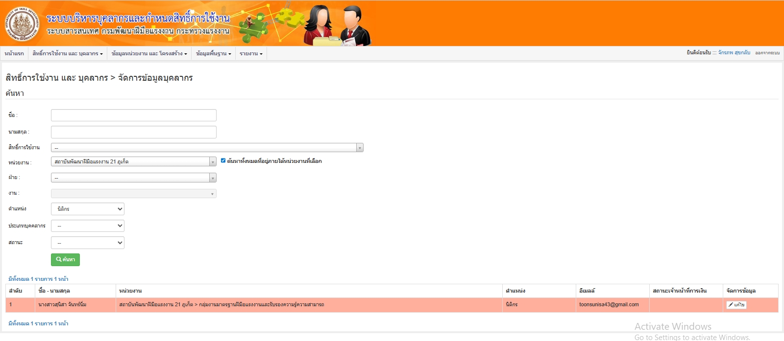 | 4953 | ระบบบริหารบุคคลากรและกำหนดสิทธิ์การใช้งานระบบสารสนเทศ | นายจักรภพ สุขกลับ | ภูเก็ต | สถาบันพัฒนาฝีมือแรงงาน 21 ภูเก็ต ขอแจ้งปัญหาระบบบริหารบุคลากรและกำหนดสิทธิ์การใช้งานระบบสารสนเทศ ไม่มีข้อมูลบุคลากรภายในหน่วยงาน จำนวน 1 ราย คือ