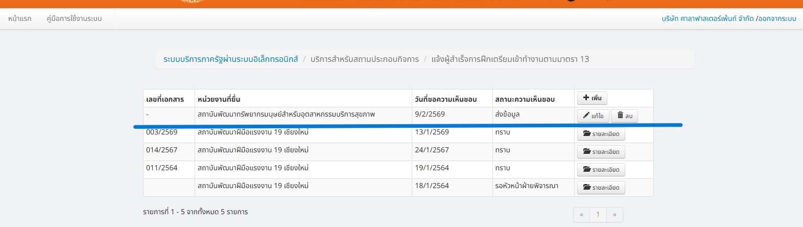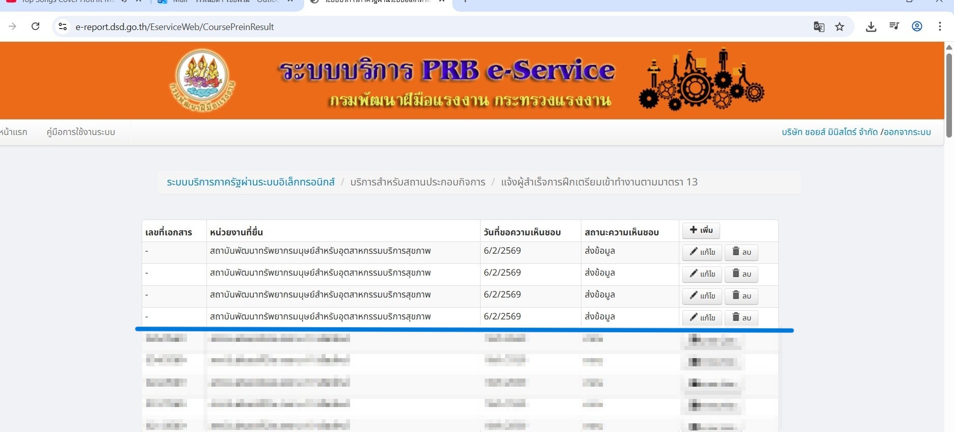 | 5461 | ระบบ New PRB e-Service | ประติภา กวีตา | เชียงใหม่ | รบกวนแก้ไขไอดีแจ้งผู้สำเร็จการฝึกเตรียมเข้าทำงาน ตามมาตรา 13 ฝึก จาก สถาบันพัฒนาทรัพยากรมนุษย์สำหรับอุตสาหกรรมบริการสุขภาพ เป็น สถาบันพัฒนาฝีมือแรงงาน 19 เชียงใหม่ ดังนี้