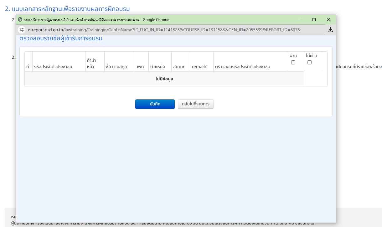 | 5459 | ระบบรายงานผลการพัฒนาฝีมือแรงงาน | นายชาญณรงค์ | อ่างทอง | รบกวนลบรุ่นการฝึก รหัสรุ่น 0321160 โดยได้สร้างรุ่นใหม่และอนุมัติใหม่ รวมทั้งทำหนังสือแจ้งให้ศูนย์เทคโนฯ ยกเลิกวุฒิบัตรตามที่เจ้าหน้าที่บอกเรียบร้อยแล้วครับ
