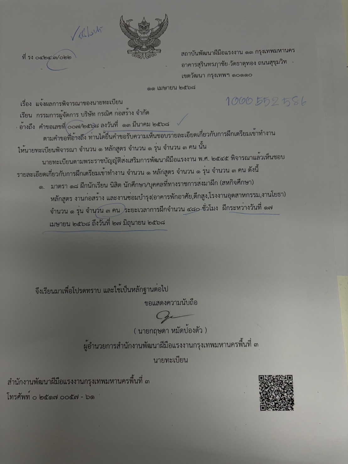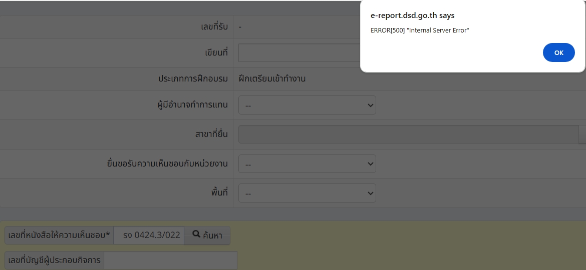 | 4779 | ระบบรายงานผลการพัฒนาฝีมือแรงงาน | นิปุณณมา สนพ.กท.3 | กรุงเทพมหานคร | ไม่สามารถยื่นแจ้งจบ รง 0424.3/022 เข้าระบบได้ค่ะ บริษัท กรณิศ ก่อสร้าง (1000552586)
